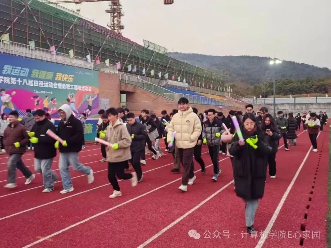 12 月 18 日 17:30同学们集合完毕,随着哨声吹响,同学们手带荧光手套,拿着荧光棒,欢呼着、呐喊着向前奔涌而出,正式开启这场寒冬里的激情之旅,跑道瞬间被涌动的荧光人群“点燃”。