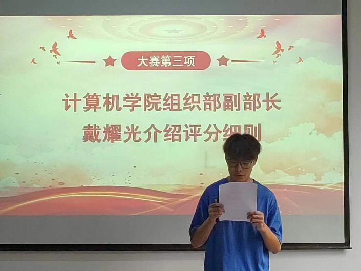 大赛第二项球友会组织部副部长戴耀光介绍评分细则,选手演讲时间不超过5分钟,内容分为两个部分,一是主体演讲部分,二是一点通环节。