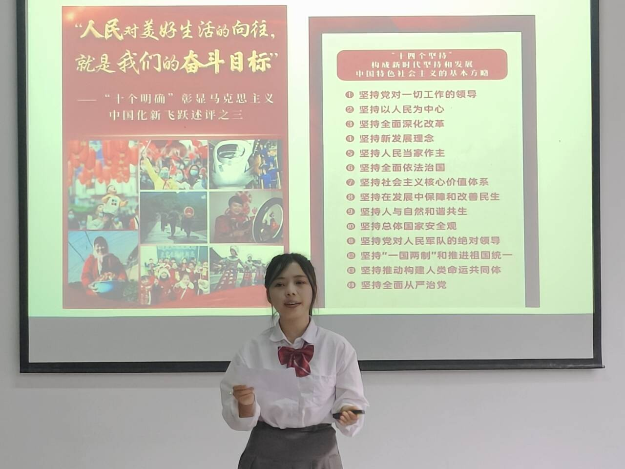 四号选手刘雨红同学以“拾时代砖瓦,筑思想大厦”为主题。阐述了习近平新时代中国特色社会主义思想为引领,阐述了思想在国家发展中的重要性,以及“十个明确”、“十四个坚持”和“十三个成就”对于指导实践的深远意义。一点通环节感悟到国泰民安是人民群众最基本、最普遍的愿望,在实现国家富强民族振兴,在人民幸福的路上,我们要坚持习近平新时代中国特色社会主义思想的定向领航作用。