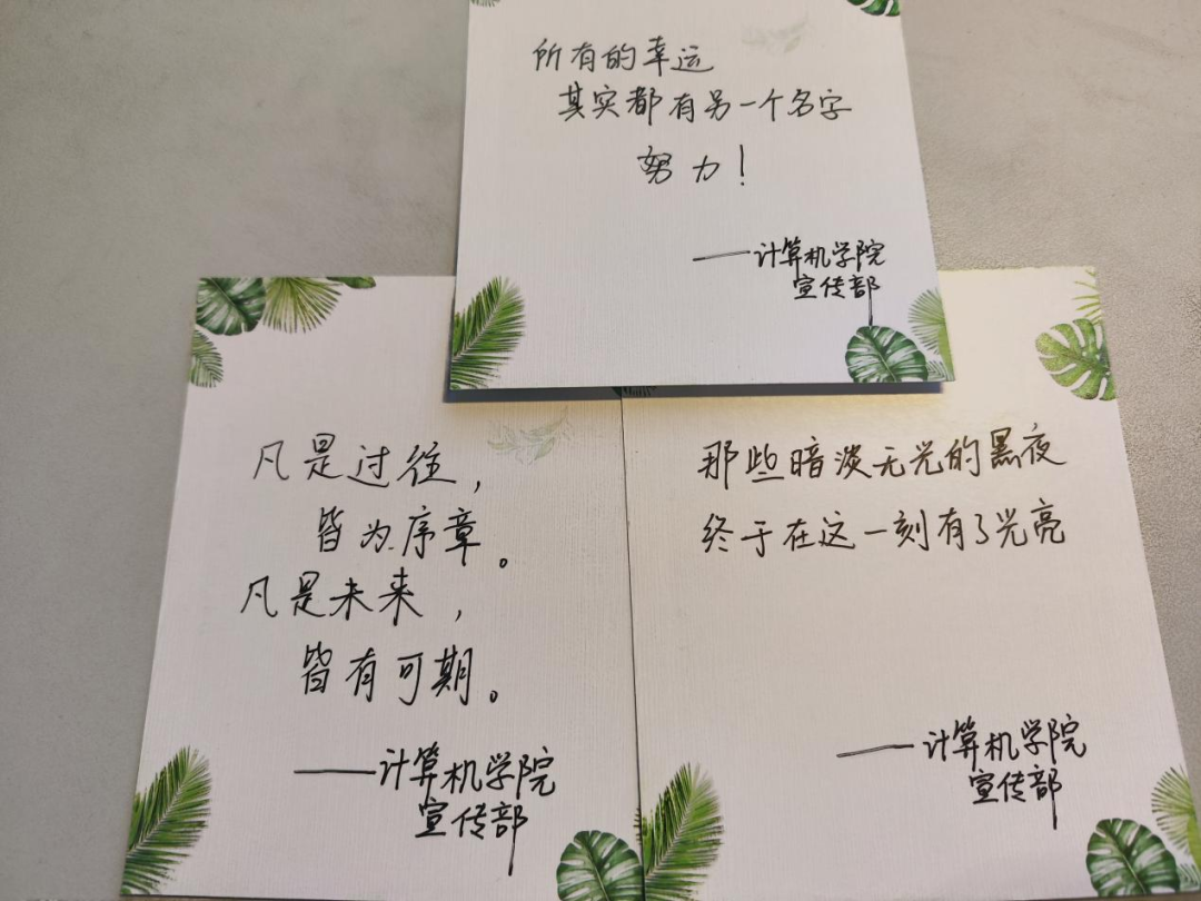 此外,团总支宣传部同学也为备考学子们送上了自己最真诚的祝愿贺卡,愿这些莘莘学子们苦尽甘来,春暖花开。
