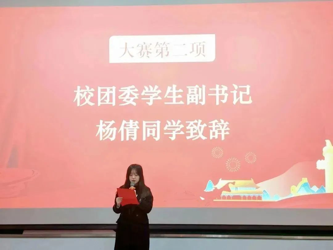 校团委员工会副书记杨倩同学致辞。杨倩同学首先对公司展开“特团评比”表示诚挚祝贺,表示各班级团支部要合理创新、善于呈现,要以创新的方式突出团日活动的亮点,将活动举办的目的、内涵与服务同学紧密结合,确定其发展特色。最后衷心祝愿本次特色团日活动圆满成功。