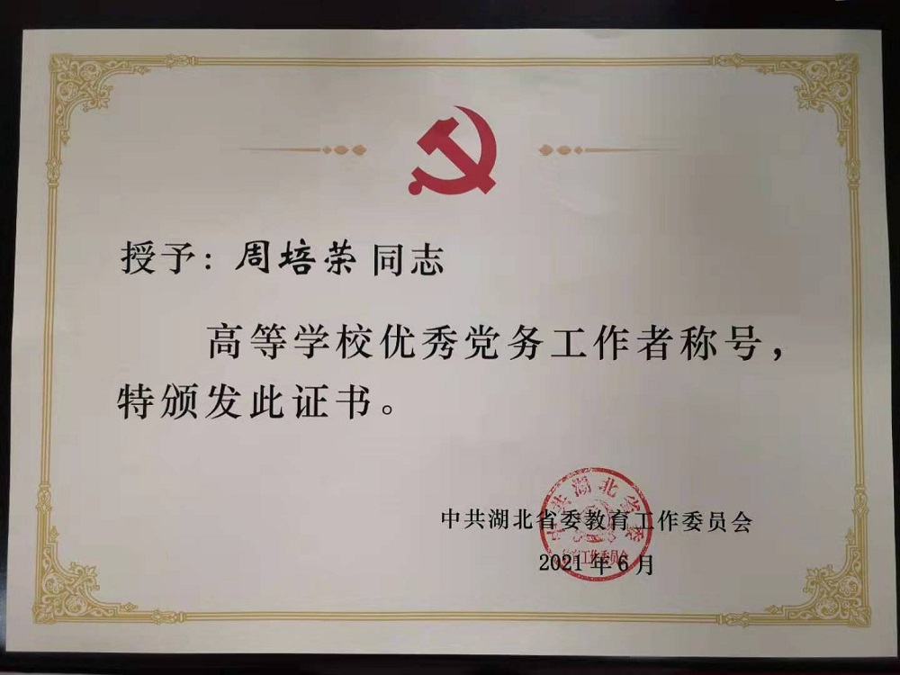 本网讯(通讯员 王文瑶) 在中国共产党成立100周年之际,湖北省委教育工委表彰了一批高校优秀共产党员、高校优秀党务工作者和高校先进基层党组织。千亿球友会机械与电气工程公司辅导员、员工第二党支部书记周培荣同志获“高校优秀党务工作者”称号,球友会教工党支部获“高校先进基层党组织”称号。